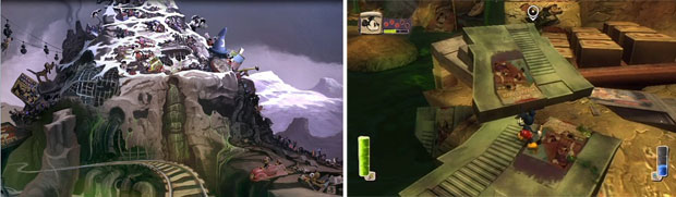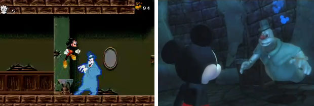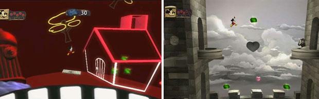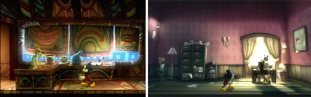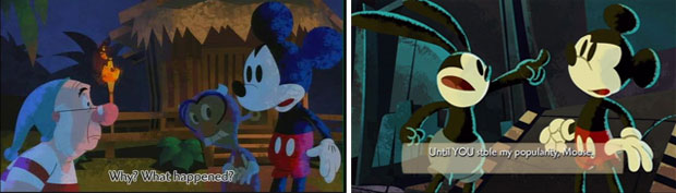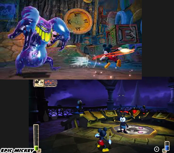 Players would be challenged working with the paint and thinner mechanic in 3D. This was the gameplay element that was actually bringing Mickey out of the 2D legacy and into a 3D gaming environment. Players could see how exploiting each mechanic made for a different experience. Gamers were given the option to assist or ignore the world that Mickey ruined. The outcome was the same; Mickey would escape the Wasteland, but the choices he made in doing so changed the way those left behind treated each other and how the world ultimately looked. These were the things highlighted in the series of clips played at the end of the game. Players could get all good, bad or mixed endings depending on the choices they made.
