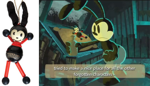This bit of pettiness on the part of Oswald was tempered by the knowledge that he had been completely forgotten by the outside world. At the core of the mountain was Oswald’s lair. Inside he kept a solitary prized possession within a cabinet. Oswald took it out in a cut scene and polished the figure before putting it back. That small toy bearing his name was the only clue of the popularity that he had before Mickey came along. It was a tiny reminder of the Disney legacy that had been forgotten. Oswald’s purpose was in trying to keep the Wasteland going for the other forgotten characters and for himself to hold onto any memories he had left of the "good old days." Again, whether critics made the connection between Mickey Junk Mountain and the core made up of a single Oswald figure was something to be considered.
