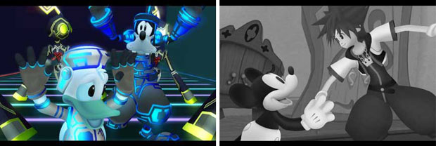Kingdom Hearts may done wonders for the Disney name in gaming circles, however that popularity came at a price. Characters were dressed up in the costumes of the films the game was crossing into. It was original when the cast dressed up in (non-canon) Tron costumes, or in the black-and-white hues of the Steamboat Willie. Yet these visuals were done mainly for the sake of fanservice, appeasing fans by using cameos and crossover reference material as visual distractions. They supplemented the lack of actual gameplay by providing hefty doses of nostalgia. These nods to fan-favorite Disney films did nothing for the play mechanic. They were used solely for the sake of pushing along a plot.