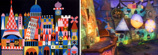The concept pieces by Gary Glover and Fred Gambino set a tone for a dystopian world, which looked like a steampunk or post-apocalyptic wasteland with only a few, but prominent Disney set pieces scattered across the landscape.