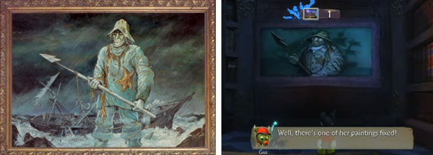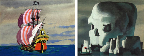 Did the game suffer because Junction Point did not create a sandbox environment out of the Wasteland? A wide-open area for Mickey to travel in, jump on and explore? If this were a complaint did the critics not wonder how much time and effort that would have taken? The levels in Epic Mickey were crammed with hundreds of layers of detail. Every corner of the lands had their own specific layout, textures, palettes, and atmosphere. Just as each “theme” part of the real Disneyland had its own personality, with unique signage, decorative elements and even trash cans. There were no repeated elements from theme area to theme area, so that Tomorrowland would feel like a glimpse into the future and Frontierland always had a classic western feel. So too did the individual levels in Epic Mickey bear many layers of uniqueness. Colors, textures, layouts featured in the title were based on the work of the legendary Imagineers, like Mary Blair, Rolly Crump which I mentioned in previous blogs. Even the legendary Marc Davis, whose concept work on the Haunted Mansion was set to tell a story of a vengeful sea captain returning from the dead. This painting was never actually featured in the original attraction but helped add atmosphere to the game.