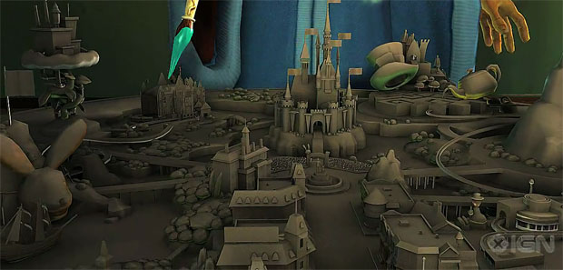 Oceans and rivers of paint thinner separated the various theme levels. In order to bypass the thinner and get from park to park Junction Point added the movie projectors. It created a mechanic to allow players to transverse the levels and layered a game-within-a-game play element. Once outside of the projects gamers were sometimes met with the same twisted scenery, oceans of thinner and bold colors that were featured in the concept art.